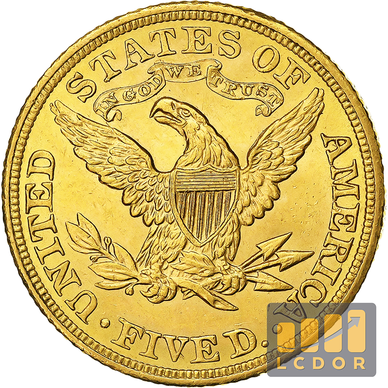 La pièce d’or 5 Dollars Liberty (8,36 g – 900 ‰, soit 7,52 g d’or pur) est une monnaie américaine emblématique, frappée entre 1839 et 1908. Son avers représente Lady Liberty coiffée d’une couronne étoilée, symbole de liberté et de prospérité, tandis que le revers arbore un aigle américain aux ailes déployées, porteur du blason des États-Unis.